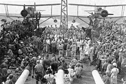 From 15–19 February 1944, Montpelier covered the amphibious landing on the Green Islands in the Bismarck Archipelago. In March, she hunted shipping south of Truk and participated in the invasion of the Emiraus. On 20 May 1944, Montpelier received light damage from return fire when she and two other light cruisers, along with eight destroyers, bombarded shore installations on Shortland, Poporang, and Magusaiai islands in the Shortlands.[2] On 1 October 1944, the US Navy's Special Air Task Force (SATFOR),[3] began shelling Saipan on 14 June to support the Mariana Islands invasion. She joined TF 58 and participated in the decisive Battle of the Philippine Sea from 19–21 June. During the engagement, Japanese carrier air groups were virtually annihilated. Montpelier returned to the Marianas, and continued her shelling of Saipan, Tinian, and Guam. She left the Marianas on 2 August for overhauling in the United States.[1]