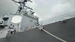 During the 2008 Cyclone Nargis crisis in Myanmar and the subsequent Joint Task Force Caring Response aid mission, Mustin, then as part of the USS Essex Amphibious Ready Group (ARG), which including USS Juneau and USS Harpers Ferry, stood by off Burma from 13 May to 5 June, waiting for the Myanmar junta government to permit US aid to its citizens.[2] However, in early June, with permission still not forthcoming, it was decided to return the ARG to its scheduled operations.[3]