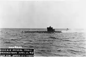 ![]() USS N-6 off Provincetown, Massachusetts, on 16 April 1918 on the 12th run of her sea trials, during which she made 10.5 knots.