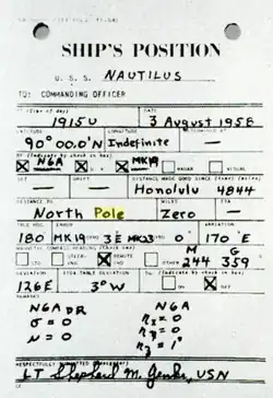 By 23 July, she set a course northward.[21] She submerged in the Barrow Sea Valley on 1 August, and she became the first watercraft to reach the geographic North Pole on 3 August at 2315 EDT.[22] The ability to navigate at extreme latitudes without surfacing was enabled by the technology of the North American Aviation N6A-1 Inertial Navigation System, a naval modification of the N6A used in the Navaho cruise missile; it had been installed on Nautilus and Skate after initial sea trials on USS Compass Island in 1957.[23] She continued on from the North Pole and surfaced northeast of Greenland after 96 hours and 1,590 nmi (2,940 km; 1,830 mi) under the ice, having completed the first successful submerged voyage around the North Pole. The technical details of this mission were planned by scientists from the Naval Electronics Laboratory, including Dr. Waldo Lyon who accompanied Nautilus as chief scientist and ice pilot.[24]