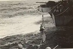 As they approached Lingayen, Task Force 79 and O'Flaherty's task unit became the target of kamikaze raids.[2] On the morning of 8 January, the ship fired a single 5-inch AA round against a Japanese aircraft approaching the nearby Task Group 79.1, her first shot in a combat operation. She ceased fire to avoid hitting pursuing American fighters, which drove off the attacker. Just after sunset, O'Flaherty put up AA fire against a lone kamikaze that crashed into Kitkun Bay, taking the escort carrier out of the fight. The ship fired further rounds against high-flying Japanese aircraft as she moved to screen the escorts assisting Kitkun Bay, and rescued a Kitkun Bay sailor from the water. She continued to screen the escort carrier and sent boats to return Kitkun Bay personnel taken off by other escorts to the carrier after she regained power on the next day.[18]