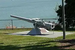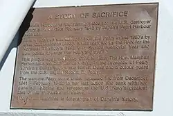 There is a memorial in Darwin in honor of the lives lost. This memorial, in Bicentennial Park, consists of a plaque and one of the 4-inch deck guns recovered from Peary. This gun is aimed towards Peary's resting place in the harbor. In the words of Peter Grose, author of An Awkward Truth: The Bombing of Darwin, February 1942, "The doomed yet magnificent reply by the destroyer USS Peary in Darwin harbour as Japanese dive-bombers swarmed around her deserves a place in the legend books of American military history".[3] The memorial was visited by President Obama and Prime Minister Gillard on November 17, 2011 as part of a ceremony dedicated to the veterans of WWII, at the end of the 60th anniversary of ANZUS Presidential visit to Australia.[4]