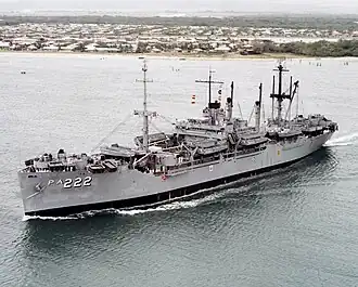 ![]() USS Pickaway (APA-222), under way in the Pearl Harbor channel, 28 April 1964.