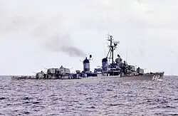 USS Porterfield (DD-682) was a Fletcher-class destroyer of the United States Navy. Commissioned in 1943, she served in several Pacific campaigns during World War II, earning ten battle stars. She was decommissioned immediately after the end of the war but reactivated in 1951 for the Korean War, earning four more battle stars, and then served continuously until 1969. She was sunk as a target in 1982.