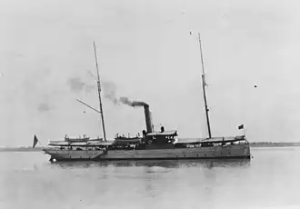 The U.S. Navy commissioned the gunboat at Cavite Navy Yard in the Philippines as USS Quiros (Gunboat No. 40) on 14 March 1900. Assigned to duty supporting the U.S. Army in the Philippine–American War, Quiros operated along the east coast of Luzon, carrying troops, providing fire support, blockading rebel villages, and making hydrographic surveys. She then switched to patrolling the Ulgan station, operating off the coast of Samar in cooperation with U.S. Army forces until 6 October 1901. She retired to Cavite for repairs from 25 February to 7 May 1902 and then proceeded to Zamboanga patrol station, where she cruised for a number of months, carrying U.S. Army troops and United States Marines on various missions. She was reported on 31 December 1903 to have gone aground on the Pearl Banks in the Sulu Sea off Borneo,[2][3] but was reported on 15 January 1904 to have been refloated with minimal damage.[4] She returned to Cavite and was decommissioned on 29 January 1904.