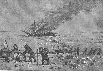 Rodgers then drifted up the bay, her rigging and sails ablaze. Early the next day her magazine exploded. A temporary shore camp sheltered the crew until the next day when they moved to the village of Noomamoo, seven miles (10 km) away. Later divided into four parties, most of the crew wintered there and in three nearby villages.