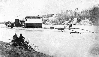 Saugus was assigned to the James River Flotilla and arrived at Fort Monroe on 1 May.[10] By 22 May, the ship was deployed with her sisters Canonicus and Tecumseh on the James River where they protected the transports of Major General Benjamin Butler's Army of the James, supplying the army as it operated on the south bank of the river during the Bermuda Hundred Campaign. On 21 June, Commander Craven of the Tecumseh spotted a line of breastworks that the Confederates were building at Howlett's Farm and his ship opened fire at the workers. The Confederates replied with a battery of four guns near the breastworks and Saugus and Canonicus joined in the bombardment. A half-hour later, Confederate ships near Dutch Gap joined in, but their fire was ineffective because they were firing blindly at the Union monitors. During the engagement, Saugus fired thirty-six 15-inch shells and was hit once by a Confederate shell that struck the deck and ricocheted into the turret; no one was wounded or killed during the engagement. Eight days later, Saugus and the side-wheel gunboat Hunchback engaged a battery at Deep Bottom Creek. The same pair of ships engaged another battery on Four Mile Creek on 30 June and 1 July.[11]