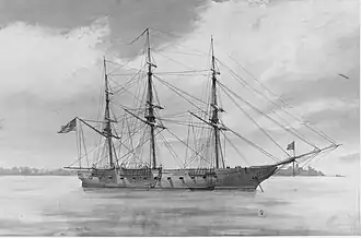 Following the start of the American Civil War, Savannah was assigned to the Atlantic Blockading Squadron in July and stationed off Savannah, Georgia, to maintain the Union Blockade of the Confederacy.[3][18] On 30 November, she found the Confederate schooner E. J. Waterman aground near Tybee Island. The schooner was carrying coffee and cigars from Havana, Cuba to Edisto, South Carolina. While most of her crew already fled, Savannah captured four crewmembers who remained onboard, including her captain. After the vessel was pulled free, a detachment from Savannah captured her and sailed her to Philadelphia.[19] She was later credited with assisting in the capture of the British blockade runner Cheshire on 6 December, which was seized by Augusta in the same area.[3][20][21] On 11 February 1862, Savannah was decommissioned and assigned to the United States Naval Academy as a training ship. She made four cruises with the Academy, all between 1867 and 1870. After her last sailing to Europe, she was laid up at the Norfolk Navy Yard before she was sold in 1883.[3][22]