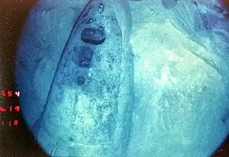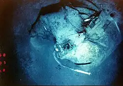 Photographs of the wreck show the submarine's detached shaft and propeller, which is missing a rotor blade. Some experienced U.S. submariners attribute the loss to flooding caused by the detached shaft.[35][36] Given that antisubmarine torpedoes were designed to seek the sound of the cavitation of the target's propeller, this could be damage caused by such a weapon.[37]