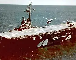 Following the start of the Korean War in June 1950, Siboney was reactivated on 22 November, as the US Navy needed to transfer active ships to the war zone. Siboney remained in the Atlantic Fleet during this period, and first went to sea on 2 February 1951. Again based out of Norfolk, she sailed south to Guantanamo for extensive training maneuvers that lasted from 27 February to 10 April. She then returned north, and in July, she cruised off Canada. She made another voyage into the Mediterranean from September to 14 November, in company with warships from other North Atlantic Treaty Organization fleets. In January 1952, she conducted tests and carrier qualifications with A-1 Skyraiders and F4U Corsairs.[6] She also carried out a pair of tests with Marine helicopter units during this period to evaluate their "vertical assault" concept, which envisioned using helicopter-borne assaults in conjunction with an amphibious invasion.[7]