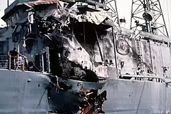 ![]() USS Stark listing after being struck by two Iraqi Exocet missiles in the Persian Gulf | |||||||