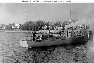 Stinger was built in 1917 with the builder's name Herreshoff No. 312 by the Herreshoff Manufacturing Company at Bristol, Rhode Island, as a private steam yacht for R. S. Russell of Boston, Massachusetts. Russell, who renamed her Stinger, had her built to a naval patrol boat design with the intention of making her available to the U.S. Navy in the event of war. Accordingly, the U.S. Navy purchased Stinger from Russell upon her completion in 1917 for use as a section patrol boat during World War I. She was commissioned as USS Stinger (SP-1252) on 11 December 1917.