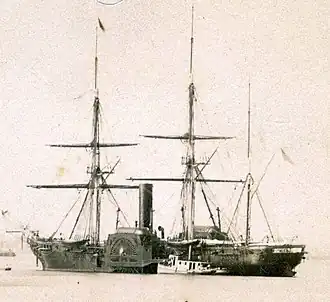 Following the end of the American Civil War, Susquehanna brought American delegates to Veracruz bay in Mexico during the destruction of the Second Mexican Empire in order to open up relations with the United States backed Mexican president Benito Juárez. When the Susquehanna found out that the acting imperial ruler Maximilian I of Mexico had decided not to abdicate, the ship turned around to head home 1866.[3] The USS Susquehanna also sailed for Brazil and operated on the Atlantic coast of South America until returning home and decommissioning on 30 June 1866. Recommissioned on 2 November 1866, the ship ended her active service as flagship of the North Atlantic Squadron. Decommissioned at the New York Navy Yard on 14 January 1868, Susquehanna was laid up until she was sold for scrapping on 27 September 1883 to E. Stannard of New York City.
