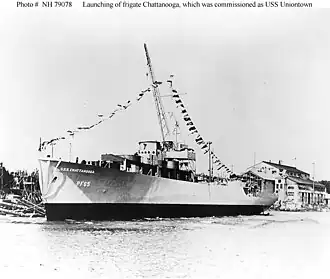 ![]() USS Chattanooga (PF-65) is launched at the Leatham D. Smith Shipbuilding Company shipyard at Sturgeon Bay, Wisconsin, on 7 August 1943, a year before she was renamed USS Uniontown just prior to commissioning.