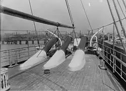 Vesuvius carried three 15-inch (38 cm) cast-iron pneumatic guns, invented by D. M. Medford and developed by Edmund Zalinski, a retired officer of the United States Army.[3] They were mounted forward side by side at a fixed elevation of 16 degrees. Gun barrels were 55 feet (17 meters) long with the muzzles extending 15 feet (4.6 meters) through the deck 37 feet (11 meters) abaft the bow. In order to train these weapons, the ship had to be aimed, like a gun, at its target. Compressed air from a 1000 psi (70 atm) reservoir projected the shells from the dynamite guns. Two air compressors were available to recharge the reservoir.[1]