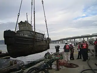 In April 1974, she concluded her long career and went out of service. Her name was struck from the Navy list, and she was sold for scrapping. The identity of her purchaser is unrecorded, but sources say that the tug was owned by the Historic Tugboat Education and Restoration Society (HTERS).[2] Wenonah was laid up at Pier 1 at Treasure Island, California, and sank in August 2009, spilling oil into San Francisco Bay.[3][4] The Coast Guard contracted Global Diving to recover the vessel to prevent further leaks, and Global Diving turned to the American Bridge/Fluor Joint Venture for use of the Left Coast Lifter sheerleg crane to recover the vessel.[5] Wenonah was turned over to the Coast Guard for disposal, and Bay Ship & Yacht in Alameda assumed the lease of Pier 1 in Treasure Island, which included taking possession of Wenonah and a sister tug owned by HTERS, USS Nokomis. Both vessels were scrapped in 2010 in Alameda.[6]