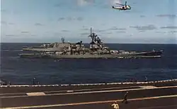 Wisconsin departed Norfolk on 25 October, bound for the Pacific. She transited the Panama Canal on 29 October and reached Yokosuka, Japan on 21 November. There she relieved New Jersey as flagship for Vice Admiral Harold M. Martin, Commander 7th Fleet.[15]