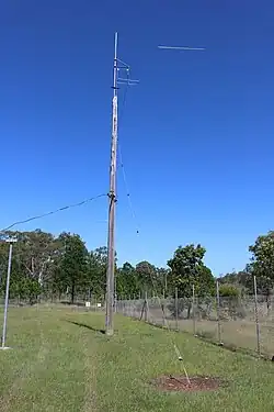 Essential to the ACAN network were the powerful antennas used to transmit and receive communications. The Signal Corps used Rhombic aerials, the most effective at the time, which could send and receive radio waves over very large distances. These aerials consisted of four high poles, up to 100 feet (30 m) tall, positioned far apart in open land and connected by wires to form a diamond shape. Each one was angled toward an overseas station, for example to San Francisco (station WVY).[33][34] At Capalaba, initially six Rhombic aerials were installed around the open paddocks, as well as several smaller, less powerful aerials known as double doublet aerials.[35][36] As the war in the Pacific intensified and the Allied forces progressively gained ground over the Japanese, an increased number of command posts were established, each connected to the ACAN network. Improvements in radio equipment at Capalaba in early 1943 also intensified the amount of communications able to be received. It was estimated that in late 1942 Brisbane received 100,000 groups per day. By early 1943, this had risen to 250,000.[37][38][1]