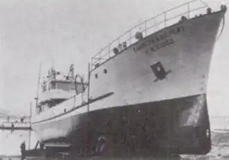 Charles H. Gilbert departed Pearl Harbor on 16 July 1953 for her 14th cruise, which took her to the waters between Hawaii and the United States West Coast, where she scouted for tuna.[23] She caught little while trolling at an average speed of 9 knots (17 km/h; 10 mph), considerably higher that the optimum trolling speed of 6 to 6.5 knots (11.1 to 12.0 km/h; 6.9 to 7.5 mph), and she made few sightings of schools of tuna thanks to rough seas and frequent overcast which hampered her scouting efforts.[23] She ran her recording thermograph continuously and detected four to six weather fronts passing her during her voyage.[23] She arrived at San Francisco, California, on 26 July 1953, and spent the remainder of 1953 and the early weeks of 1954 undergoing alterations at a California shipyard while US FWS Hugh M. Smith took up her skipjack-scouting duties off Hawaii.[23] Charles H. Gilbert′s alterations included lengthening her by 28 feet (8.5 m) to accommodate greater laboratory space, giving her a length of 118 or 120 feet (36 or 37 m) (sources differ).[1]