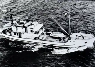 Originally designed for exploratory fishing using longline and live-bait techniques to determine the distribution of tuna in the central Pacific, her role evolved over the years as she underwent modifications to better support the research of fisheries scientists and marine biologists as their understanding of tuna biology increased, and by 1960 she had become a marine research station capable of longlining, trawling, transporting live bait, and gathering oceanographic data.[1] In 1959, she became the only tuna-fishing vessel in the world outfitted with observation chambers incorporating underwater viewports, which gave embarked scientists an unprecedented ability to observe directly the behavior of tuna and bait fish in the water (rather than infer their behavior through statistical analysis ashore) and record the behavior for future study through the use of still photography and film.[1] She also gathered meteorological data and even made gravimetric observations in support of geophysical analysis of the Earth.