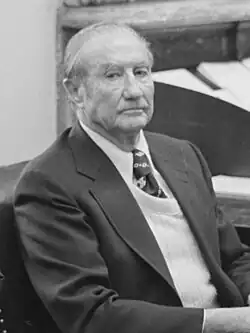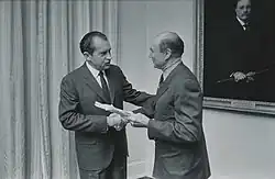 In an April 25, 1969 Senate floor speech, Thurmond stated that The New York Times "had a conflict of interest in its attacks on Otto F. Otepka's appointment to the Subversive Activities Control Board."[85] On May 29, Thurmond called for Associate Justice William O. Douglas to resign over what he considered political activities.[86] Douglas remained in office for another six years.[87] In the latter part of the year, President Nixon nominated Clement Haynsworth for associate justice.[88][89] This came after the White House consulted with Thurmond throughout all of July, as Thurmond had become impressed with Haynsworth following their close collaboration. Thurmond wrote to Haynsworth that he had worked harder on his nomination than any other that had occurred since his Senate career began.[90] The Haynsworth nomination was rejected in the Senate.[91] Years later, at a March 1977 hearing, Thurmond told Haynsworth, "It's a pity you are not on the Supreme Court today. Several senators who voted against you have told me they would vote for you if they had it to do again."[92]