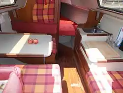 The design has sleeping accommodation for five people, with a double "V"-berth in the bow, a drop-down dinette table on the port side that forms a double berth and a single quarter berth on the starboard side that extends under the cockpit. The galley is located on the starboard side just forward of the companionway steps. The galley is equipped with an optional two-burner alcohol-fired stove, a single sink with hand-pumped water supply and a portable icebox. The optional head is located in the bow cabin on the port side under the forward section of the "V" berth and consists of a portable toilet. The cabin sole is teak and holly. Ventilation is provided by a hatch over the bow cabin. Below decks headroom is 57 in (145 cm).[1][9][3]