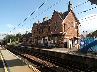The building on Station Road, housing various public facilities,[6] leads to Platform 1 (Glasgow-bound trains). A footbridge over the double track connects to Platform 2 (Motherwell/Edinburgh-bound trains) and the car park.