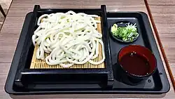 - Zaru udon: chilled udon noodles topped with shredded nori and served on a zaru (笊/ざる, a sieve-like bamboo tray). Accompanied by a chilled dipping sauce, usually a strong mixture of dashi, mirin, and soy sauce. Eaten with wasabi or grated ginger.