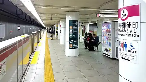 Ueno-okachimachi Station (上野御徒町駅, Ueno-okachimachi-eki) is a subway station in Taitō, Tokyo, Japan, operated by the Tokyo subway operator Toei Subway. It is numbered E-09.
