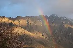 Rainbow in the evening sun at The Remarkables. Uenuku is a famous atua of the rainbow.