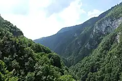 The area along the Ugar is known as Pougarje. Pougarje extends from the Vitovlje village to the Ugar's entrance into the canyon below Skender Vakuf. It is located between Ranča Mountain (left) and rock's massif Korićanske stijene - Ugarske stijene (Ugar's rocks).[6] From Vitovlje to Ugar's canyon it is known as the Lower (Donje) Pougarje, while the area on Ranča's slopes is Upper (Gornje) Pougarje.[7][8][2][9]