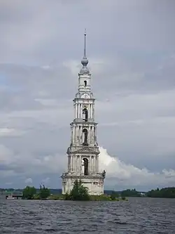 Plant construction began in 1935[3] and the first excavator arrived in January 1936. The plant's design was approved on May 23, 1938 by the Economic Council of the USSR Council of People's Commissars, modeled after the Rybinsk hydroelectric station.[1] Gulag prisoners were used in the construction.[3] Many villages and the old part of Kalyazin were flooded by the reservoir created by the dam.[3] Some of the oldest buildings in the region, including the 15th-century Intercession Monastery in Uglich and the 16th-century Trinity Monastery in Kalyazin, were submerged by the reservoir.