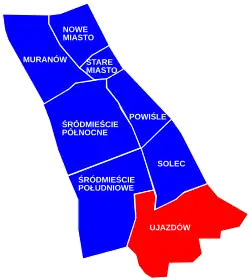 ![]() Location of Ujazdów neighbourhood (red) in the District of Śródmieście (navy blue) | |