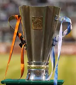 The Ukrainian Super Cup (Ukrainian: Суперкубок України) is an association football game of the Ukrainian Premier League in traditional super cup format that acts as the grand-opening for every new football competition season in Ukraine. Originally it was set as a contest between the winners of the previous season's Ukrainian Championship and Ukrainian Cup. From 2008 through 2014, it was branded as the Inter Super Cup of Ukraine, in 2017[1] – Super Cup Fokstrot.