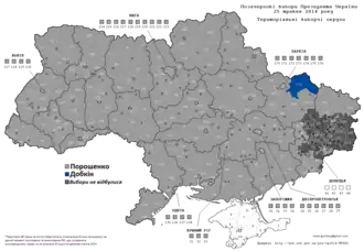 Snap presidential elections were held in Ukraine on 25 May 2014 and resulted in Petro Poroshenko being elected President of Ukraine.[1] Originally scheduled to take place on 29 March 2015, the date was brought forward following the 2014 Ukrainian revolution.[2][3] Poroshenko won the elections with 55% of the vote, enough to win in a single round.[4][5] His closest competitor, Yulia Tymoshenko, received 13% of the vote.[4] The Central Election Commission reported voter turnout over 60%, excluding the regions not under government control.[6][7] Since Poroshenko obtained an absolute majority in the first round, a run-off second ballot (scheduled for 15 June 2014[8]) was unnecessary.[1][9]
