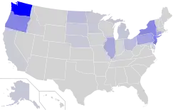 | New York City Metropolitan Area,[2]Rochester Metropolitan Area, Rust Belt (Pennsylvania, Ohio, Michigan, Indiana, Illinois), Midwest (Minnesota, North Dakota), Greater Los Angeles Area, Sacramento, Alaska, Washington state, and the Pacific Northwest in general, Maryland, Florida, Virginia, Texas, Arizona, Colorado, North Carolina, Georgia[3] | |