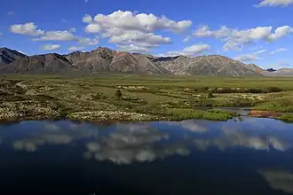 ![]() A ridge of the Ulakhan-Chistay Range reflected on Lake Buyunge | |