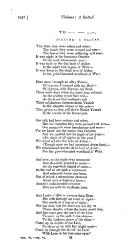 "Ulalume - A Ballad" was finally published, albeit anonymously, in the American Whig Review in December, 1847. Originally, Poe had sold his essay "The Rationale of Verse", then unpublished, to the Review's editor George Hooker Colton. Colton did not immediately print the manuscript, so Poe exchanged it for "Ulalume".[20]