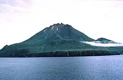 Uliaga Island (also spelled Uliagan, Ouliaga, and Ouilliaghui;[1] Russian: Уляга) is the northernmost member of the Islands of the Four Mountains group in the Aleutian Islands of southwestern Alaska. The island's name is probably derived from the Aleut place name ulaĝa, which is itself derived from ulaẍ - "bearberry."[2] The triangular shaped island measures about 2.4 miles (3.9 km) across and consists of a single stratovolcano cone that reaches a height of 2,913 feet (888 m).[3] The island has an area of 3.44 square miles (8.9 km2). No eruptions have been recorded in historical times, though it is thought to have been active at some time during the Holocene Epoch.[3]