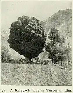 ... In a garden near our sarai we saw some very fine karagach.[2][3] The karagach or Turkestan elm is one of the typical trees of the Duab landscape, chiefly owing to its tendency of forming leafy balloons of great regularity. As the main limbs shoot upwards like a bunch of flowers gradually unfolding near the top, and as the secondary boughs follow this example, the inner space of the cupola of foliage is a tangle of close-set ramifications which retains dead branches as well as the flotsam and jetsam of the air. As moreover short spikes and twigs grow out everywhere, the whole forms a disorderly nest of bark, leaves, sticks, and straws affording protection to many small birds. |