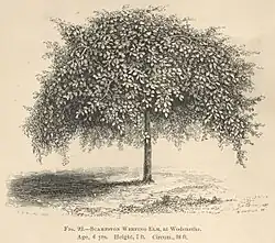 Loudon described the Scampston Elm, in a letter of 1836 to the Newcastle Courant, as "generally understood to have been extensively planted in Northumberland about 80 years ago".[11] The Scampston Elm was in cultivation on both sides of the Atlantic in the 19th century and was occasionally referred to as Ulmus americana pendula.[12][13] (Other European elms described as 'American' by various nurseries include 'Vegeta',[14] 'Lutescens',[15] and 'Nana'.[16]) The American horticulturalist Frank Jesup Scott in The Art of Beautifying Suburban Home Grounds of Small Extent (1870) described how two "Scampston elms" could be pruned and trained to form an archway of weeping elm.[17] "A weeping variety of the Scampston Elm" was described at the Royal Victoria Park, Bath, in 1857 and 1902, where was listed as U. montana Glabra [:'smooth'(-leaved)] microphylla pendula.[18][19] One tree was planted in 1896 as U. glabra scampstoniensis at the Dominion Arboretum, Ottawa, Canada.[20] Three specimens supplied by the Späth nursery of Berlin to the Royal Botanic Garden Edinburgh in 1902 as U. glabra [:'smooth'(-leaved)] Scampstoniensis[21] may survive in Edinburgh, as it was the practice of the Garden to distribute trees about the city (viz. the Wentworth Elm).[22][note 1][23] A specimen obtained from Späth before 1914 as U. glabra scampstoniensis, and planted in 1916, stood in the Ryston Hall arboretum, Norfolk,[24] in the early 20th century.[25] Elwes saw the decayed stump of the original tree at Scampston Hall, by which time (1913) the tree was no longer known to be in cultivation in nurseries in England.[2] 'Scampstoniensis' continued to be distributed by the Späth nursery and the Hesse Nursery of Weener, Germany, into the 1930s.[26][27]