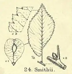'Smithii' made a small to medium-sized tree,[4] with ascending branches bearing long pendulous shoots, downy when young and developing corky ridges.[5] The oval leaves are dark green, glabrous and glossy above, < 8.5 cm long by 4.0 cm wide, downy beneath, and long acuminate at the apex. Bean described them as "coarsely double-toothed", with 14–16 pairs of lateral veins, and a petiole about 0.75 inches (19 mm) long.[6][5][4][7][8][9]