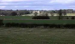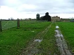 The manorial enclosure was at least 1.6 hectares, and is considered to have been fairly high status. It was bounded by a wall of dressed limestone blocks, and contained a fishpond and dovecote. The fishpond was cut into an old ridge and furrow field, and the residence itself is believed to be underneath the present Ulnaby Hall. There is evidence of a succession of buildings on the site, terminating in the 19th century, but the village had shrunk by the 17th century, indicating the effect of the change from labour-intensive arable land to pasture. A survey of Ulnaby Hall shows a single-phase build in the late 16th century of a south-facing building of one large room over another and two wings at the back, with service rooms to the west. Two of the original gardens, to the south and east of the hall, still exist, and the third was probably the garth field or paddock to the south of the farm track. There was a smithy, five barns and orchards.[2] One of the peasant houses was quite large, having three rooms.[3] It is thought that the southern end of the site, around the water channel, was a marshy area that provided the village with various resources, and that it was drained in the 18th century.[3]