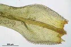 Ulota mosses tend to grow in a tuft on the substrate, with the shoots growing in an acrocarpous fashion with the shoots standing up.[10] The tufts can vary in colour, ranging from a deep green at the top of the tuft to a darker brown/red at the base of the cushion.[4] The oblong to linear-lanceolate leaves are attached to an erect stem, and can be slightly flexed to fully curled when dry.[11][5] The genus is characterized by the slightly to fully curled leaves when dry. The leaves have a costa, or midrib, which runs the entire length of the leaf.[5] The leaves have hyaline cells at the basal margins of the leaves, which are typically square or rectangular shaped.[11] The leaf base can be expanded or gradually tapered as it connects to the stem.[12] At the tip of the leaves, there are cells with very thick cell walls.[13] At maturity, the sporangia can be ribbed or unribbed.[4] The sporangia sit on top of a seta, which holds it above the gametophyte. Between species of Ulota, there is variation in the length of the seta which can be a useful trait in classifying species.[12] The sporangia have peristome teeth are diplolepidous, with 8 to 16 exostome teeth and 8 endostome teeth.[11][5] The sporangia sit on top of a seta which attaches to the gametophyte at the apex of the shoot.[3] The calyptra covers the developing sporangium and is typically conic, split at the base, and can be naked or hairy.[5] The rhizoids are placed at the base of them stem, occasionally appearing along the stem, and are smooth.[4]