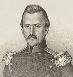 He served as a Feldwebel in the federal intervention in Basel Country in 1833 and was promoted to Unterleutntant in the artillery in 1834.[2] In 1836 he became Lieutenant and was deployed to the Bernese Jura.[2] Two years later, when France threatened a military intervention if Switzerland refused to extradite Louis Napoleon Bonaparte, he was deployed to the french border but Bonaparte eventually prevented a conflict by his voluntary departure from Swiss territory.[2] Ulrich Ochsenbein was a leader of the unsuccessful second Freischarenzug against Lucerne in 1845.[4] Over a hundred people died in the attack and 2000 prisoners were taken by Lucerne.[4] Ochsenbein and Jakob Stämpfli only narrowly managed to escape.[4] Since he was one of the leaders of the campaign against Lucerne, the Tagsatzung expelled him from the General Staff.[5] Following the cantons of Lucerne, Zug, Valais, Schwyz, Fribourg, Uri and Unterwalden created the so-called Sonderbund.[6] In 1847, he led a military force from Bern against the Sonderbund which then was also defeated in the Sonderbund war.[5]