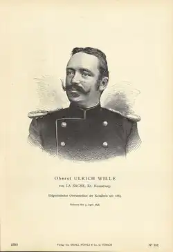 From the beginning of his activity as an instructor in Thun in 1872, Wille reflected on the methods to be applied in his field and published articles on military policy.[1] In 1880 he bought the Zeitschrift für Artillerie und Genie ("Journal for Artillery and Engineering"), which he used to campaign for military training reform according to the Prussian model until his appointment as chief instructor of the cavalry.[1] Promoted to colonel in 1885, Wille was made commander of the cavalry in 1892.[1]