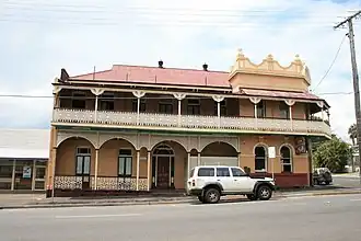 The hotel, situated on a corner site on the gentle slope of Brisbane Street, is a prominent landmark with the streetscape.[1]