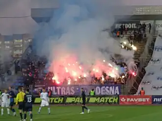 Ultra Desna (Ukrainian: Ультрас Десна) is the organized supporters group of the Ukrainian multi-sports club Desna Chernihiv. They are quite famous for supporting and following their team, at home and away.[1] In particular they show a warm welcome when them team enter in any stadium to play supporting the club until the end of every single. During Desna's matches the fan area displays a great view of white and blue being worn.[2][3]