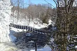 - 5.1 kilometres (3.2 mi) west, winding the north side of route 116 and the railroad, and back into Durham-Sud, to a stream (coming from the west);