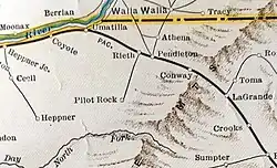 The Umatilla Central Railroad built a 14.21-mile (22.87 km) branch line of railroad in Umatilla County, Oregon, U.S., connecting the main line of the Oregon Railroad and Navigation Company (OR&N) at Rieth to Pilot Rock. The company was incorporated on May 24, 1906, and was operated under lease by the OR&N from opening date, December 16, 1907, until December 23, 1910, when the properties of both were sold to new Union Pacific Railroad (UP) subsidiary Oregon–Washington Railroad and Navigation Company.[1] The line has survived as UP's Pilot Rock Industrial Lead.[2]